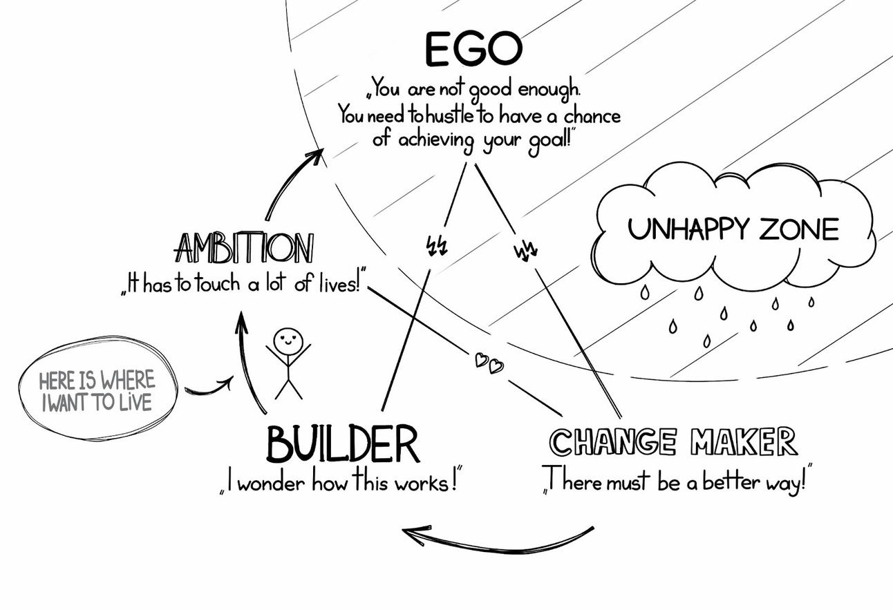 The tension between these parts is necessary for the creative process, a battle of wills that the artist or founder has to be able to conduct—or else the positive tension turns to back-breaking struggle. The curious builder lets me try something, just by playfully experimenting. Then the ambitious achiever barges in, proclaiming, ‘let’s do this for real’, and then imposter ego joins in the cacophony, stating ‘you’ll fail if you don’t work incredibly hard.’